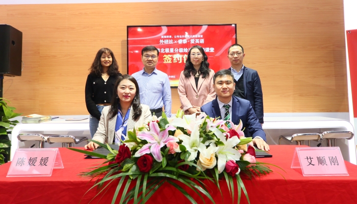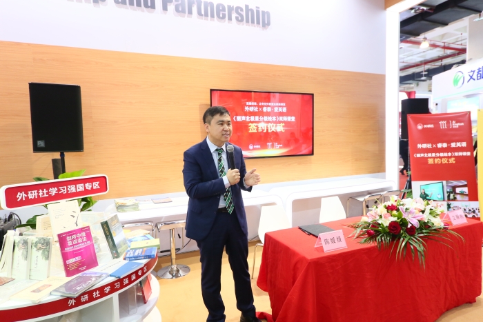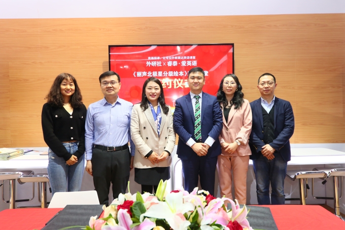 3月31日上午,外研社·睿泰爱英语《丽声北极星分级绘本》双师课堂合作签约仪式在北京图书订货会举行。外研社党委副书记陈媛媛与睿泰集团董事长、总裁艾顺刚分别为本次活动致辞,并签署合作协议。