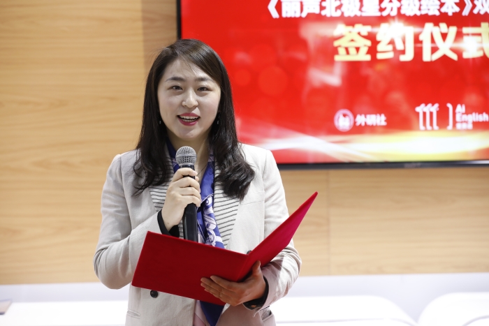 外研社党委副书记陈媛媛在致辞中提到,近年来,外研社一直在积极探索英语阅读线上和线下教学的融合,希望用科技为出版社内容资源赋能,让教学与学习逐步打破时间和空间的界限。此外,优质外教在国内尤其是在广大的二三四线城市一直稀缺,外研社联合睿泰集团旗下爱英语共同打造推出《丽声北极星分级绘本》双师课堂,相信能够解决学校的痛点,助力学校教育升级。