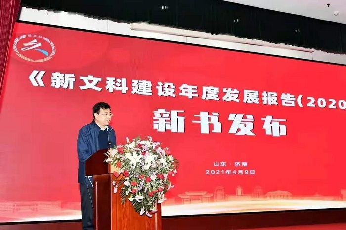 2021年4月9日,全国新文科教育研究中心在济南珍珠泉宾馆召开“新文科建设高峰论坛2021:迈入新台阶”活动,并举行《新文科建设年度发展报告(2020)》(订购)新书发布仪式。全国新文科教育研究中心副主任、山东大学校长助理、人文社科研究院院长邢占军教授为新书发布致辞。教育部高等教育司一级巡视员宋毅,山东省委教育工委副书记、省教育厅党组副书记、副厅长白皓,山东大学校长、教育部新文科建设工作组组长樊丽明,山东大学出版社社长陈斌共同为新书揭幕。