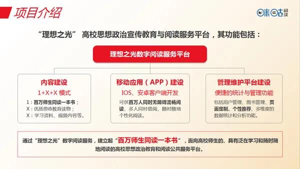 该项目精选思政类红色读物和哲学社会科学等类别著作百余部,推荐了《将改革进行到底》《法治中国》等思政类教育视频,支持百万师生同读一本书。同时,支持在线阅读和离线下载阅读,无校园局域网限制。自适应的精排版设计,在很好地保留了纸书内容的基础上,对版式、样式、字体等进行优化,独特的TTS语音朗读功能,也让师生用户解放双眼,想听就听。通过自主式后台管理,相关管理部门还可以方便管理用户信息,推荐数字内容,发布资讯,实时监测用户阅读数据等,了解大学生的学习阅读习惯,进一步掌握全省师生思想政治教育的情况,并为指导下一步省内高校思想政治教育工作提供有力的依据。