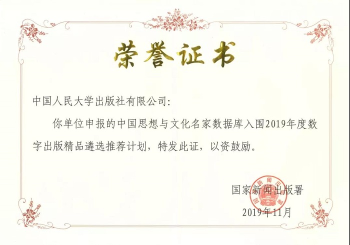 近日,由国家新闻出版署主办的“读掌上精品 庆百年华诞——百佳数字出版精品项目献礼建党百年专栏”上线,中国人民大学出版社“中国思想与文化名家数据库”从1000个候选名单中脱颖而出,入选“专业与学术出版类”专栏。