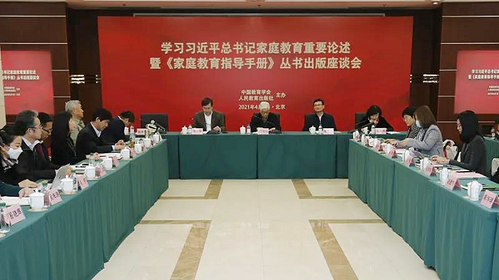 2021年4月1日,由中国教育学会和人民教育出版社共同主办的学习习近平总书记家庭教育重要论述暨《家庭教育指导手册》丛书出版座谈会在北京举行。中国教育学会名誉会长、北京师范大学资深教授顾明远,教育部基础教育司副司长陈东升,中国教育学会秘书长杨银付,人民教育出版社党委书记、社长黄强,教育部基础教育教学指导专业委员会家庭教育指导专委会主任、北京师范大学中国教育政策研究院执行院长张志勇,教育部基础教育教学指导专业委员会家庭教育指导专委会副主任、首都师范大学校长孟繁华,中国儿童中心党委书记丛中笑,教育部基础教育教学指导专业委员会家庭教育指导专委会副主任、中国青少年研究中心家庭教育首席专家孙云晓等领导、专家和校长、教师及家长代表50余人参加会议。会议由中国教育学会副秘书长张东燕主持。