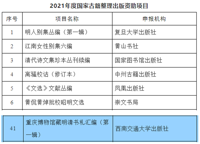 2021年4月25日,国家新闻出版署公布了2021年度国家古籍整理出版资助名单,39家出版社共87个项目入选。西南交大出版社申报的“重庆博物馆藏明清书札汇编(第一辑)”成功入选。