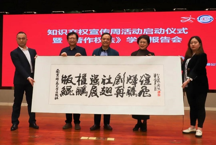 活动最后,江苏省版权协会向南京师范大学出版社赠送了一幅由著名书法家徐国麟题词的书法作品,祝愿南京师范大学出版社“版权强社创辉煌,鲲鹏展翅再腾飞”。