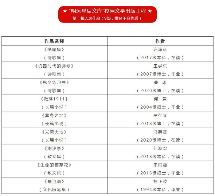 目前,该工程面向四川大学所有在校学生和已毕业校友征稿,重点支持青年作者特别是在校学生,作品体裁包括小说、诗歌、散文、剧本、科普作品等,暂定每年出版一辑,每辑收录作品10种左右。入选作品将由四川大学文学与新闻学院资助、四川大学出版社出版,并在每年四川大学校庆期间举办新书发布会。