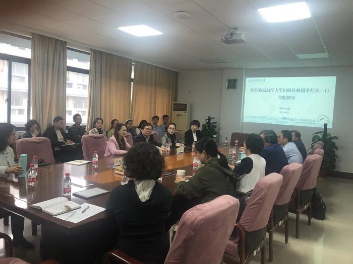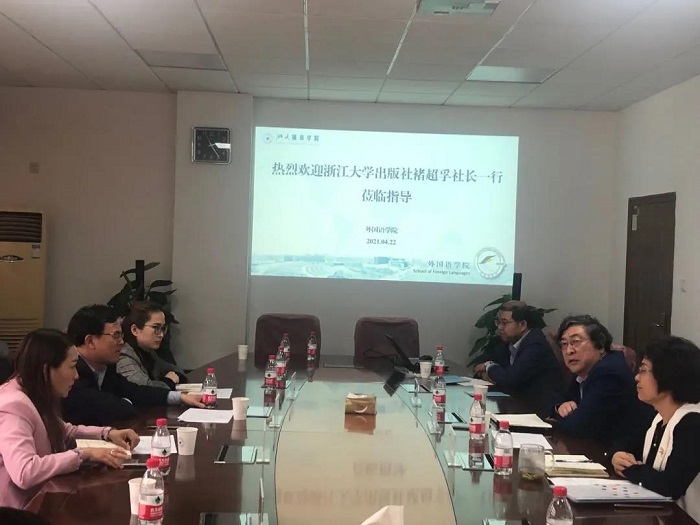 4月22日,浙江大学出版社社长褚超孚、副总编辑张琛、国际文化出版中心主任包灵灵、国际文化出版中心主任助理黄静芬一行赴浙大城市学院外国语学院座谈。浙大城市学院外国语学院院长马博森、党委书记刘春香、院长助理陈存军、各系部主任、各研究所负责人和部分骨干教师参加座谈。