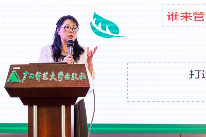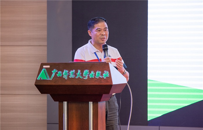 广西师范大学出版社集团公司高教分社运营总监、玉林分社社长张贻松主持专家主题报告会 (黄国生 摄)