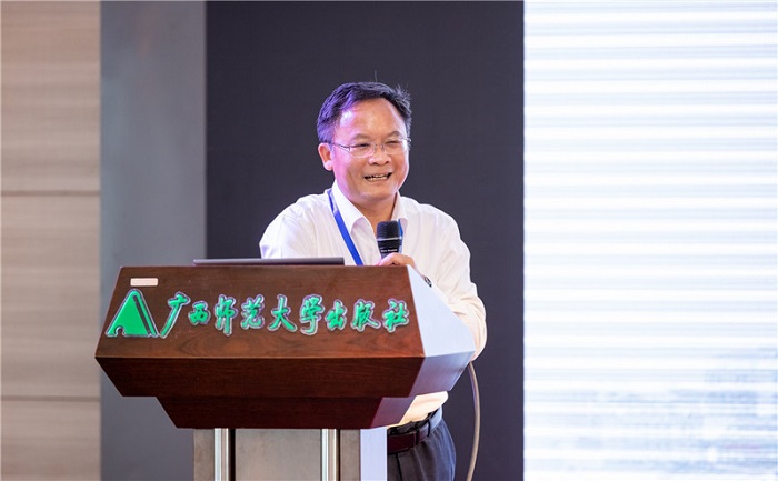广西师范大学副校长林春逸教授作题为 《新时代大学生劳动教育教材编写和课程建设的探索》的报告 (黄国生 摄)