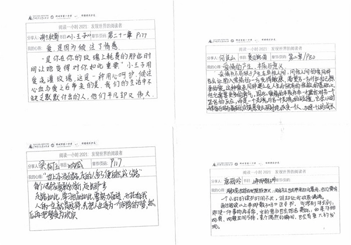 “长时间静下来全身心投入阅读,对我来说是一种享受,对我来说,读书可以与各位大师交流。走进他们的世界,是另一种方式的旅行,沿途的风景和自己的收获就是最好的收获。”这是柳州市一中博雅读书沙龙的一名读者在广西师范大学出版社集团公司“阅读一小时”阅读卡上的留言。