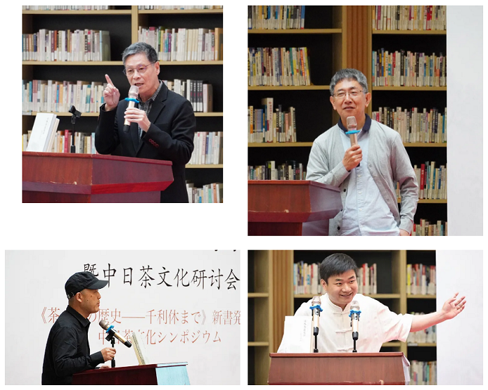 图注:(自左而右,自上而下)分别是 《日本茶道史话——叙至千利休》译者、华东师范大学陆留弟教授致辞 《現代語訳南方録》译者、浙江农林大学关剑平教授致辞 复旦大学李辉教授致辞 大唐贡茶院院长林瑞炀致辞