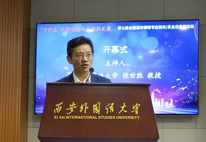 论坛开幕式由教育部高等学校外国语言文学类专业教学指导委员会德语分委员会(以下简称为“教育部外指委德分委”)委员、西安外国语大学欧洲学院院长张世胜教授主持。