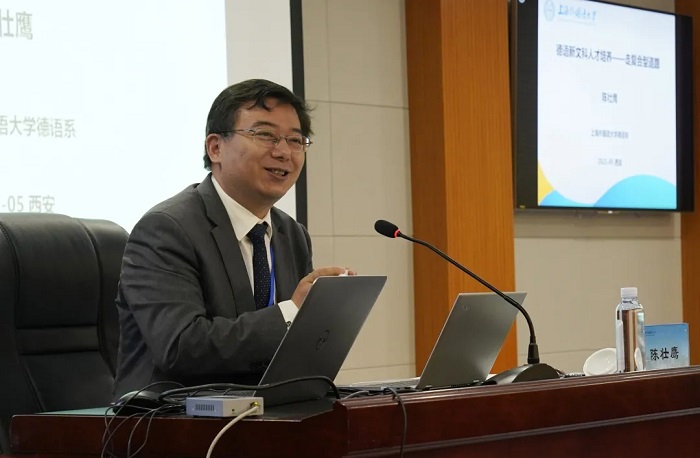 教育部外指委委员、德分委副主任委员、教育部备案上外中德人文交流中心主任、上海外国语大学德语系主任陈壮鹰教授的报告题为“新文科人才培养——走复合型道路”。他提出,在当前的新文科背景下,外语专业努力走出一条复合型人才的培养道路已是大势所趋。陈壮鹰教授详细介绍了上外德语系在“德语语言文学+德国经济学”双本科学位和“德语+工商管理”双学士学位这两个复合型人才培养项目的运作情况,并同与会代表分享了上外德语系在这方面积累的经验。在报告最后,他强调,德语专业建设和发展应始终保持特色,夯实学科根基,在新形势下做出更多新探索,赋予学生真正的复合价值。