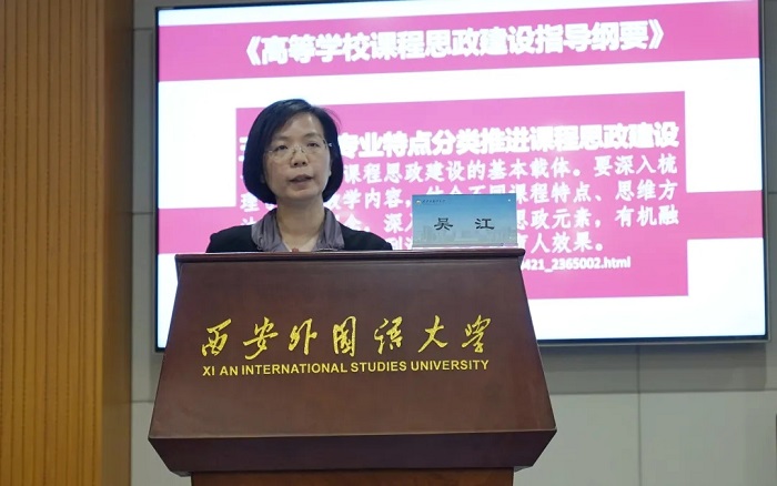教育部外指委德分委秘书长、北京外国语大学德语学院院长吴江教授带来了题为“德语专业课程思政的教学设计”的主旨报告。她首先阐释了课程思政的概念内涵,然后分析了德语专业的思政优势,最后对课程思政教学设计提出了具体的建议。吴教授认为,课程思政资源取之不尽,应将各种人文学科内涵积极融入思政课堂中;课程思政的教学设计重在以问题为导向,充分激发学生的学习兴趣并引发师生共同的思考;课程思政须言之有物、动之以情、晓之以理,以润物细无声的方式,让知识入脑,使价值观入心。