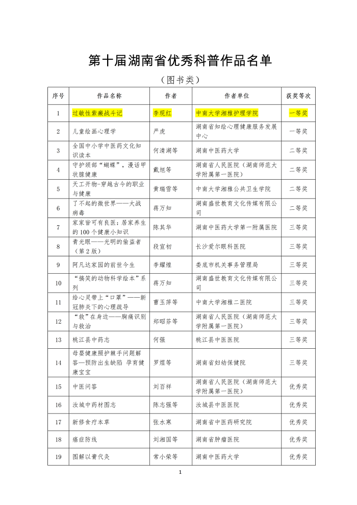 为深入学习贯彻习近平新时代中国特色社会主义思想,全面落实党的十九大精神,普及科学知识、弘扬科学精神,激励广大科技工作者和社会各界参与科普创作与出版的积极性,湖南省开展了第十届省优秀科普作品评比。