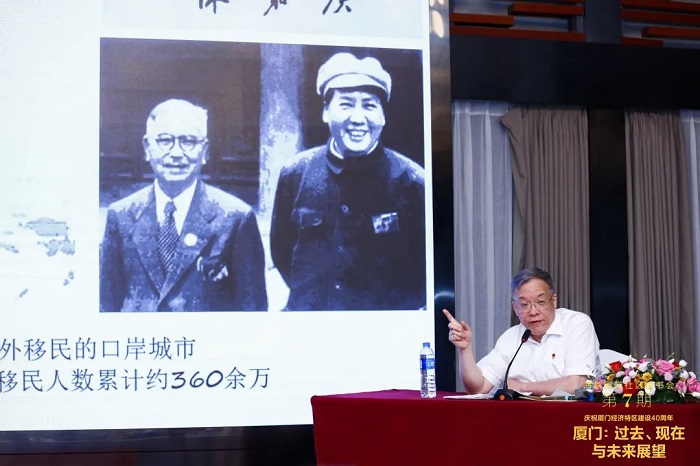 1984年来到厦门工作的胡家榕会长亲历厦门经济特区发展的如歌岁月,见证厦门经济特区的沧桑巨变,他对老厦门历史如数家珍,用亲身经历、所见所闻娓娓道来,既有宏观视野,又有微观角度,不时穿插闽南语,讲述不为人知的小故事,引发全场热烈掌声。近两个小时的讲座内容涵盖厦门这座城市的政治经济、市政建设、文教体育、对外交流、百姓民生等各个方面。无论是艰难岁月建设者筚路蓝缕的创业征程,还是改革开放“杀出一条血路”的勇敢探索,在胡家榕会长图文并茂的生动演讲中,厦门的历史与现实清晰展现在面前。