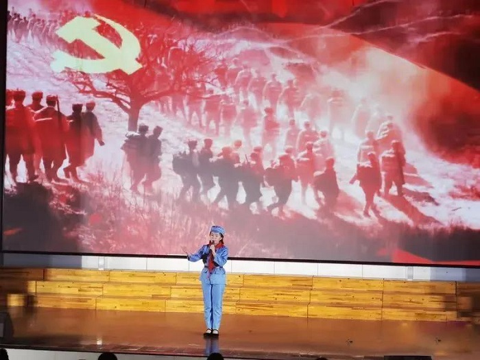 “哎呀嘞哎,不怕那热浪浓雾风雨狂,你几晓得同志哥,格是革命斗志冲云霄!”一阵欢快的山歌在台上唱了起来。这是于都县城关小学五年级学生冯馨怡带来的钟生贵孜烈士一路长征一路歌,把客家山歌唱到了陕北,唱到了红军胜利大会师的故事。鲜为人知的先烈动人事迹,让在场观众为之动容。