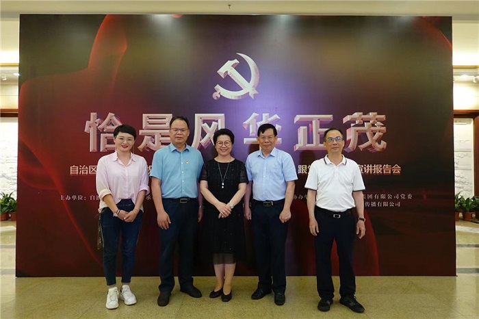 5月30日,由自治区国资委党委主办,广西北部湾投资集团、广西师范大学出版社广西师范大学出版社集团公司党委承办,广西路桥工程集团党委、北京人间道文化传播有限公司协办的“恰是风华正茂——自治区国资国企庆祝中国共产党成立100周年‘感党恩 跟党走’主题宣讲报告会”在广西人民会堂精彩亮相。广西师范大学出版社广西师范大学出版社集团公司党委书记、董事长黄轩庄,党委副书记、纪委书记蓝廖国,首席编辑曹光哲出席报告会。