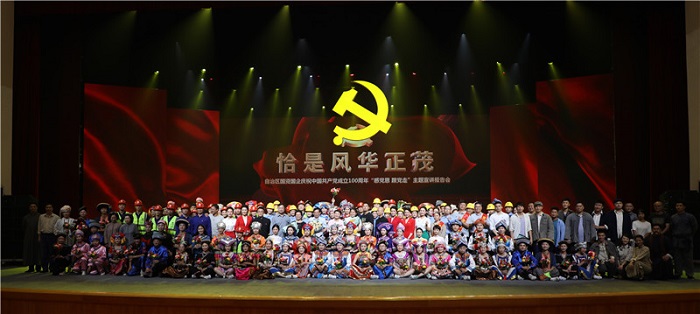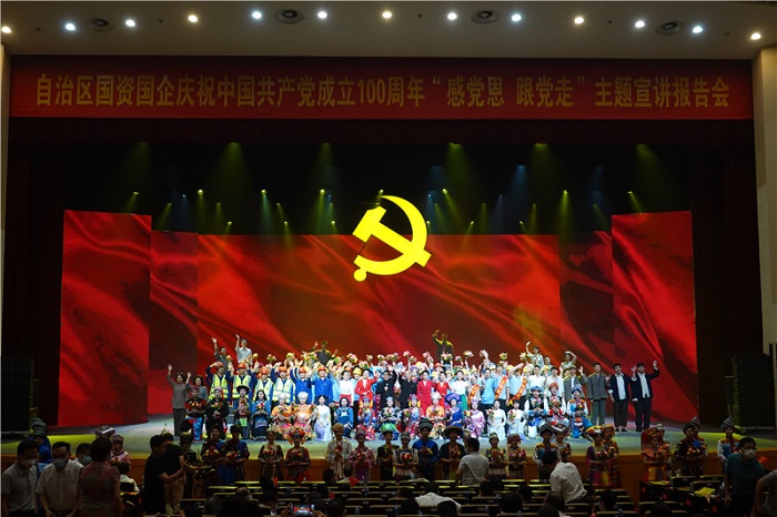 作为承办、协办单位之一,广西师范大学出版社集团公司充分发挥出版社的文化优势,承担了本次主题宣讲报告会的项目策划和总体设计工作。据了解,此次参加演出的145名宣讲人和演员全部为广西北部湾投资集团在职党员干部职工,用不到一个月的时间完成了主题宣讲报告会的各项准备工作,并在演出中取得了圆满成功。