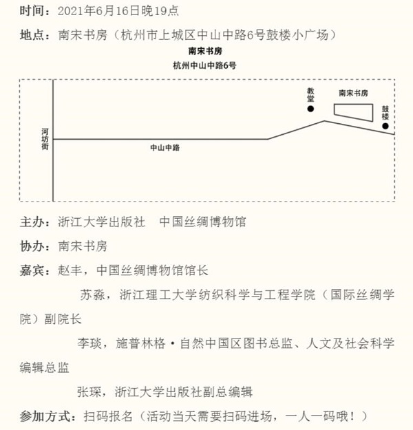 6月16日晚19点,由浙江大学出版社、中国丝绸博物馆主办,南宋书房协办的“2021丝绸之路周”系列活动之“锦秀之夜”图书对话会将在杭州南宋书房举行。