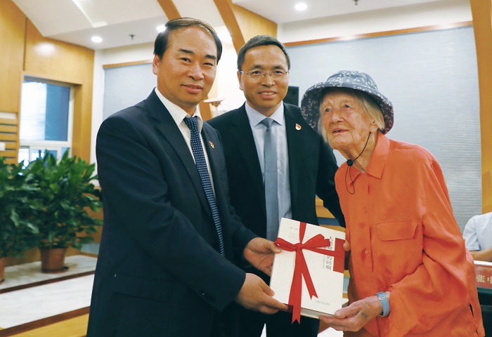 《人类命运的回响——中国共产党外语教育100年》主编王定华教授、杨丹教授向教育部领导、各外语院校领导和作者代表伊莎白教授赠书。
