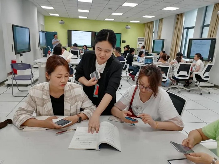 培训讲座后,苏大社读者服务部向参培教师赠送苏大社出版的新形态教材样书,教师现场扫码体验新形态教材,并就教材制作成本、服务年限、资源平台、教材安全性等问题积极提问,苏大社数字出版部人员一对一解答,现场气氛热烈。