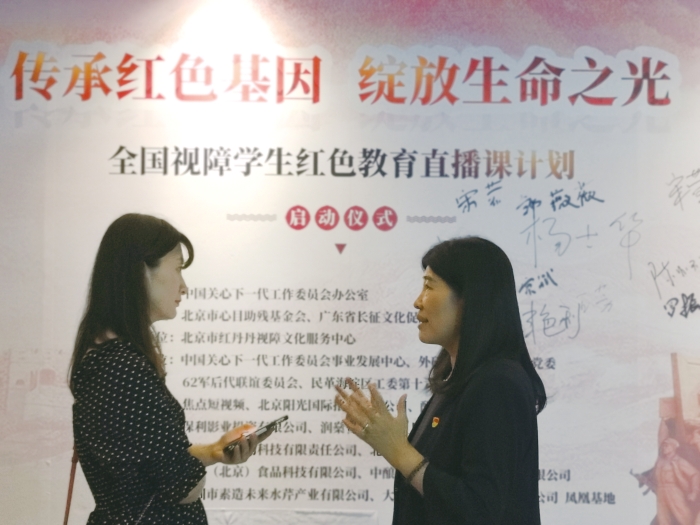 2021年6月19日下午,由北京市心目助残基金会、广东省长征文化促进会主办,北京市红丹丹视障文化服务中心(以下简称“红丹丹”)承办,外研集团(外研社)党委支持的“传承红色基因绽放生命之光”全国视障学生红色教育直播课计划启动仪式在“红丹丹”心目影院举行。外研集团(外研社)党委书记、董事长,外研社社长王芳等出席了启动仪式,全国近100所盲校和特殊教育学校的8000名视障学生通过网络直播同步观看了启动仪式并参与互动交流。