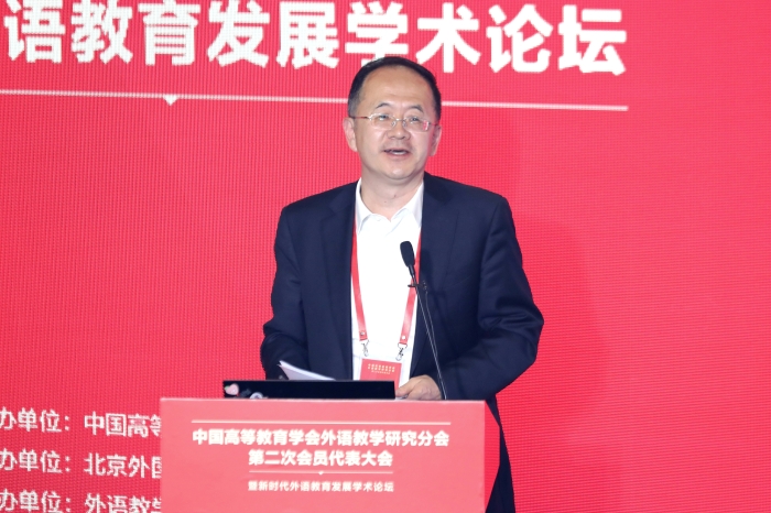 北京外国语大学党委书记、第二届理事会理事长王定华发表讲话。王定华指出,我国正处于实现中华民族伟大复兴的关键时期,高等教育特别是高等外语教育需要认真研判、准确识变、精准定位。一是新冠疫情促使外语教育形态发生新变化。大规模在线教学全方位促进高等教育数字化转型,催生未来外语教育新业态。二是加强国际传播工作对外语教育战线提出新要求。在构建人类命运共同体、共建“一带一路”的背景下,外语战线应一马当先,发挥作用,全面加快外语能力建设,主动对接国家战略需求,为中国参与全球治理、为我国国际话语体系建设做出应有贡献。三是新时代教育对外开放对外语类院校提出新目标。要提升我国高等教育人才培养的国际竞争力,加快培养具有全球视野的高层次国际化人才。四是科技迅猛发展对外语教育教学提出新挑战。现代技术的变化发展不仅影响外语教育的目标,也影响其内容、技术、手段、标准、方法、理念等,引发人们对外语教育教学的深入思考。