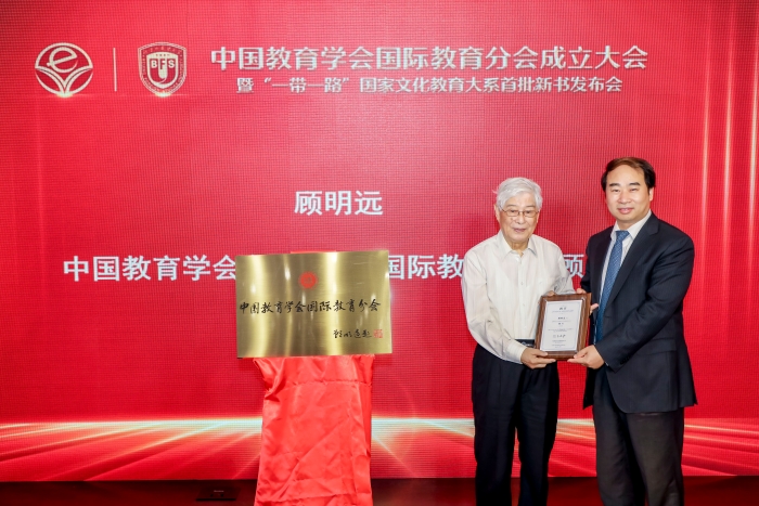 中国教育学会名誉会长、国际教育分会顾问顾明远,北京外国语大学党委书记、国际教育分会理事长王定华,中国教育学会秘书长杨银付共同为中国教育学会国际教育分会揭牌。