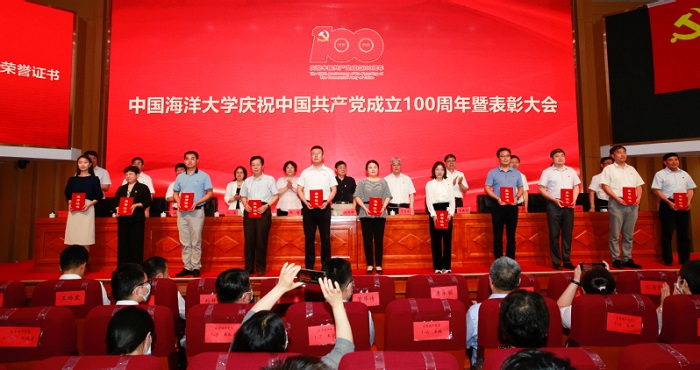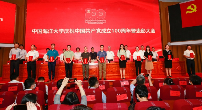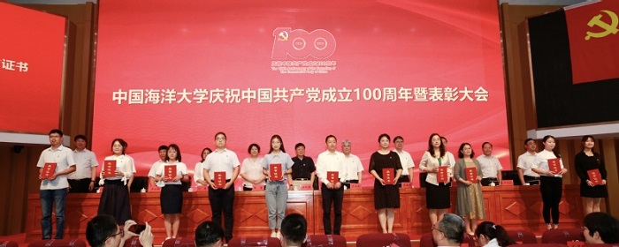 6月30日上午,中国海洋大学庆祝中国共产党成立100周年暨表彰大会隆重召开,为获得“光荣在党50年”纪念章的学校老党员代表颁发纪念章,对中国海洋大学2020年度优秀共产党员、优秀党务工作者和先进党支部进行表彰,同时对学校脱贫攻坚工作先进个人及先进集体、抗击新冠肺炎疫情工作先进个人及先进集体进行表彰。