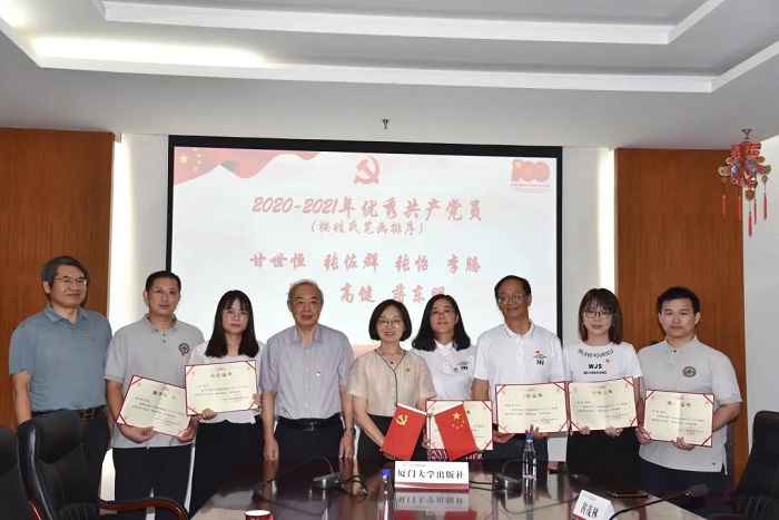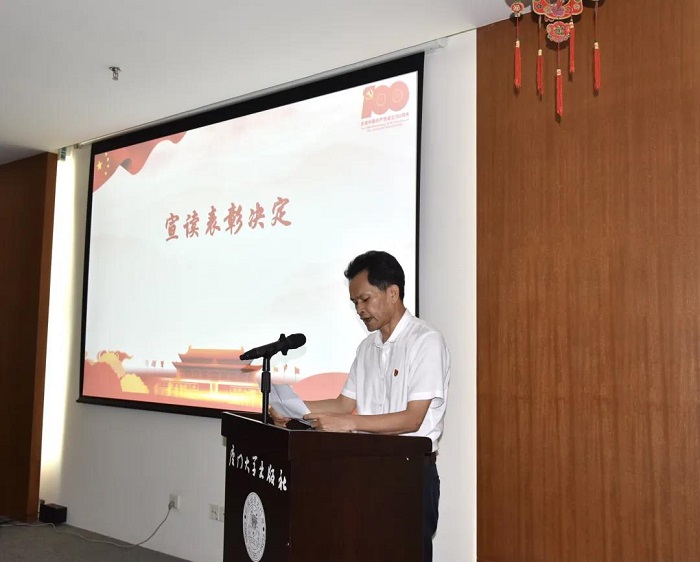 大会在全体党员齐唱庄严的《中华人民共和国国歌》中拉开帷幕。厦门大学出版社郑文礼社长宣读了社党总支《关于表彰出版社2020-2021年优秀共产党员的决定》,总编辑宋文艳、副总编辑徐长春、退休党员代表陈福郎为受表彰的7名优秀共产党员颁发荣誉证书。