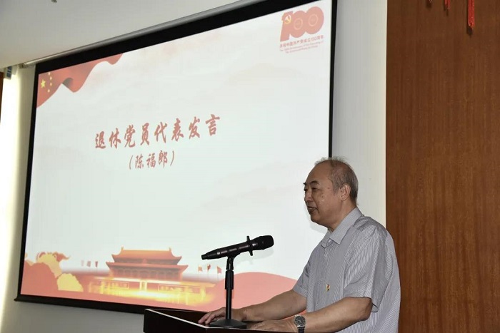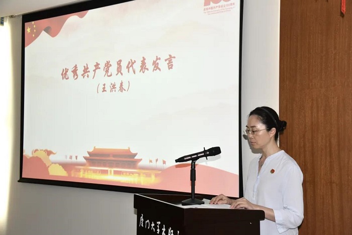 本次获得厦门大学表彰的优秀共产党员、总编办主任王洪春和出版社退休党员代表陈福郎分别上台发言。王洪春同志从认真细致、履行党员责任,主动作为、展现党员风范,先锋引领、突出党员担当,热心公益、彰显党员初心等方面讲述自己的事迹;她提到,“父母都是光荣在党50年的老党员,自己从小接受革命传统教育熏陶,在思想上、行动上同党中央保持高度一致,听党话跟党走”。陈福郎老师表达了7月1日收看庆祝中国共产党成立100周年大会的激动心情,并从一名老党员、老出版人的角度,对出版社的年轻党员提出期待,鼓励党员同志们在助力文化自信上添砖加瓦。
