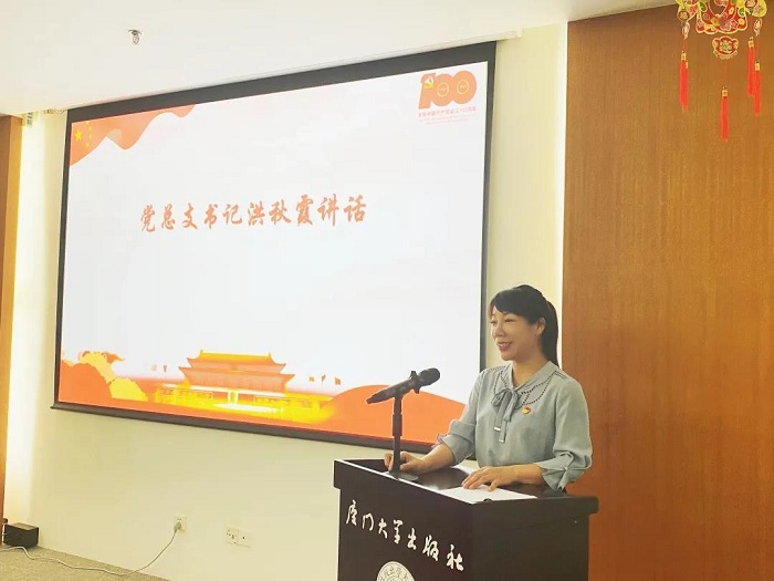 厦门大学出版社党总支书记洪秋霞代表社党总支向为党的事业和出版社发展作出贡献的老党员致以崇高敬意,向受到表彰的个人表示热烈祝贺,向在全社各个岗位上辛勤工作、甘于奉献的共产党员致以节日问候。“中国共产党百年风华正茂,出版社历经36载仍征途漫漫。我们重温党的辉煌历程,就是要统一思想和行动,主动适应新形势、把握新常态,全面推进出版社党的建设各项工作,有效发挥出版社党组织战斗堡垒作用和共产党员先锋模范作用,带领全社取得更大的成绩。”洪秋霞书记带领大家简要回望中国共产党百年辉煌历程,并结合厦门大学建校百年,立足出版社发展实际,对党员干部们提出要求。她强调,要深入贯彻落实习近平总书记致厦门大学建校100周年重要贺信精神,深入学习习近平总书记在庆祝中国共产党成立100周年大会上的重要讲话精神,牢记初心使命,坚定理想信念,践行党的宗旨,学习先锋模范,努力成为有作为、敢担当的新时代出版人。