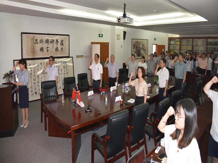 面向鲜红的中国共产党党旗,洪秋霞书记举起右拳,带领党员重温入党誓词。