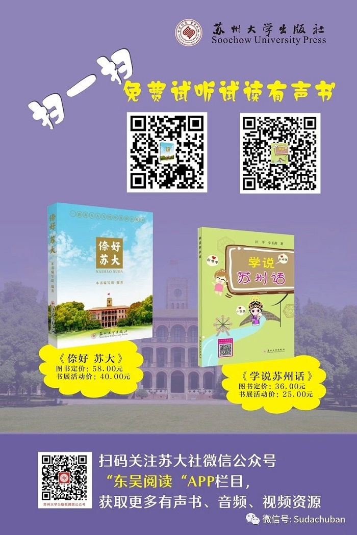 7月7日至7月11日,有声书《学说苏州话》、《倷好苏大》和“东吴阅读”APP平台部分电子书、音频、视频资源将免费向读者开放。更多免费资源可关注苏州大学出版社微信公众号“东吴阅读”栏目。