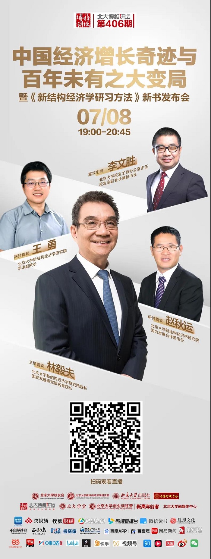 直播平台: 北大博雅讲坛APP、北大学堂、长安街读书会、新华网、央视频、咪咕视频、中国知网、腾讯新闻、搜狐财经、凤凰网、网易新闻、百度百家号、微信读书、微博、抖音、快手、Bilibili、京东、当当、天猫、中国经营报、正和岛、微信视频号、财经app、今日头条、西瓜视频、知乎