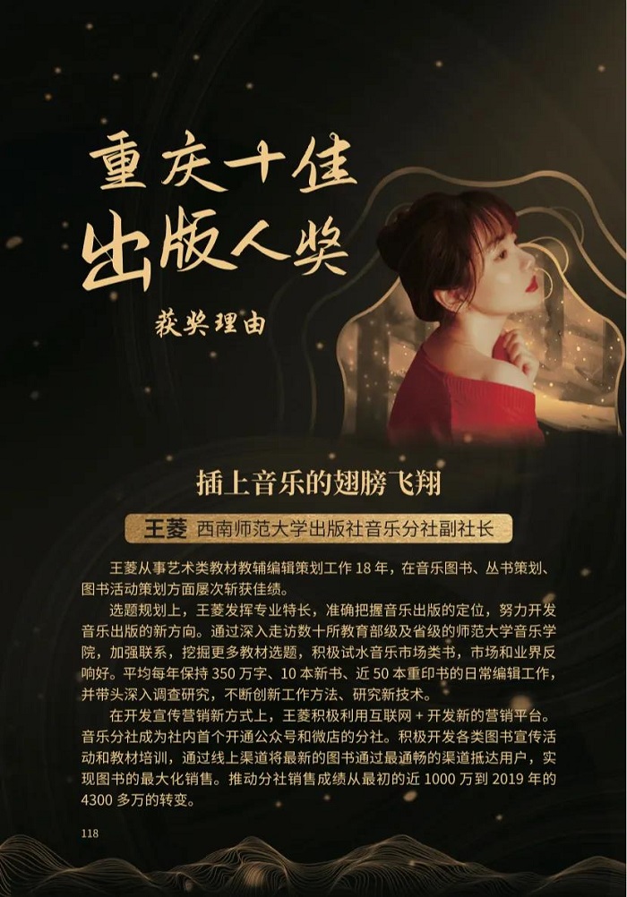 本文转自华龙网(2020年12月29日)。王菱现为出版社音乐分社社长,2020年被评为重庆十佳出版人。
