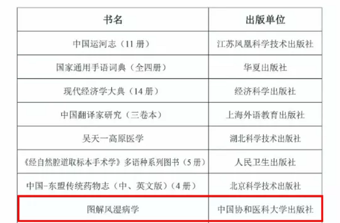 6月18日,第五届中国出版政府奖评选工作领导小组办公室对“第五届中国出版政府奖入选获提名奖名单”予以公示,中国协和医科大学出版社《图解风湿病学》入选获提名奖。