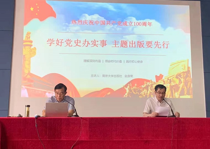 为庆祝中国共产党成立100周年,南京大学出版社党总支书记金鑫荣为全体党员讲授题为“学好党史办实事,主题出版要先行”的专题报告。本次报告严格遵照习近平总书记在党史学习教育动员大会上的重要讲话精神,旨在结合工作实际,深刻开展党史宣传教育,普及党史知识,推动党史学习教育深入群众、深入基层、深入人心。