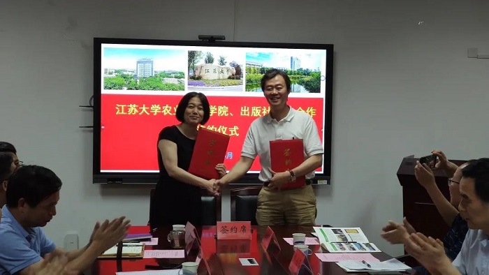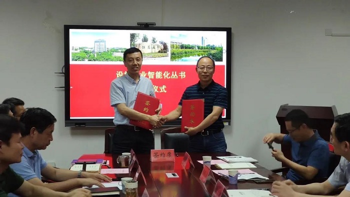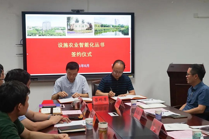 陈远东、刘继展代表双方签署“设施农业智能化丛书”出版合作协议,共同打造高质量、高效益、高影响的教材和专著。