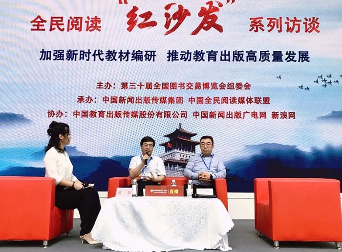 开幕式当天,人民教育出版社社长黄强、高等教育出版社社长苏雨恒,受邀参加“红沙发”访谈,针对“加强新时代教材编研,全民阅读推动教育出版高质量发展”这一主题进行了深入交流。中国教育出版传媒集团公司总经理殷忠民出席了访谈活动。