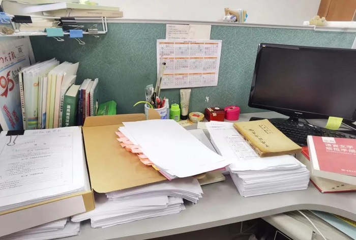 攻坚战打响后,特别是出版社召开百年校庆图书出版大干180天动员大会之后,早已有一大批书稿正在文编室校对或等候校对,另有一批正在路上。繁重的校对任务就像一座大山,编校工作没有捷径,我们深知,唯有像愚公一样靠着坚持和韧劲,才能一点一点移走前面的“大山”。此时从未松懈的心弦无疑绷得更紧,科室上下凝心聚力,通力合作,除了社里规定的周六全天加班,“八小时之外”也是随时待命——任务一分配下来就充分利用个人可利用的所有时间,只要身边有合适的桌椅,我们随时可以铺开书稿,旁若无人地开始校对。单身青年没空交朋友谈恋爱,经常在单位加班至错过打卡时间;准妈妈大着肚子加班加点;年轻妈妈边带娃边看稿;老员工随身携带滴眼液和其他缓解眼部疼痛的药物……这是为百年校庆图书出版攻坚克难的关键时期我们常有的工作状态。