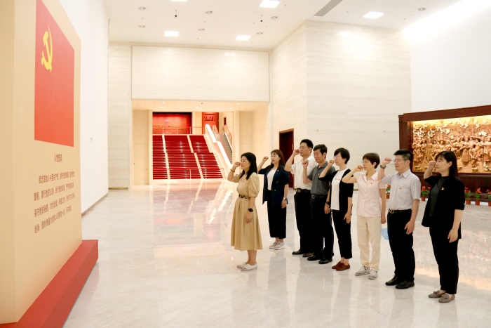 党史展览馆宣誓厅气氛庄严肃穆。面向鲜红的党旗和入党誓词,王芳书记举起右拳,带领大家重温了入党誓词。“我志愿加入中国共产党,拥护党的纲领,遵守党的章程,履行党员义务,执行党的决定……”铮铮誓言掷地有声,汇聚起砥砺前行的精神力量。