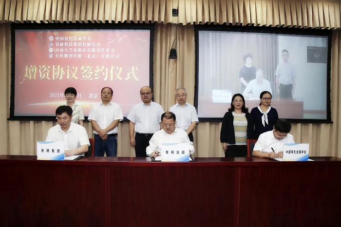 中国有色金属学会、有研科技集团有限公司(简称有研集团)、中南大学出版社有限责任公司(简称中南大学出版社)增资有科期刊出版(北京)有限公司(简称有科出版)签约仪式在北京、湖南长沙同步举行。中国有色金属学会秘书长张洪国,有科出版董事长周旗钢,有研集团副总经理王兴权,中南大学校党委常委、副校长周科朝,中南大学出版社社长吴湘华出席仪式并签约。