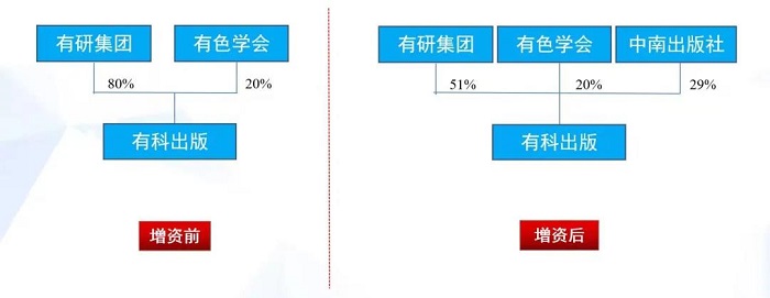 本次增资入股是中南大学出版社以有色行业唯一期刊数据库“中国有色金属知识库”所有权作价入股有科出版,是中南大学出版社在中宣部、中南大学等上级单位领导下,在中国有色金属学会、中国科协、有研集团大力支持下,深入贯彻落实习近平总书记“要办好一流学术期刊和各类学术平台”等重要指示批示,落实党中央“建成一批具有国际竞争力的品牌期刊和若干出版集团”等系列部署,探索资本与科技期刊产业融合的一次重要实践,增资之后,中南大学出版社持股29%,有色金属学会持股20%,有研集团持股51%。