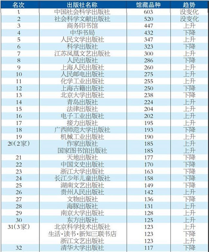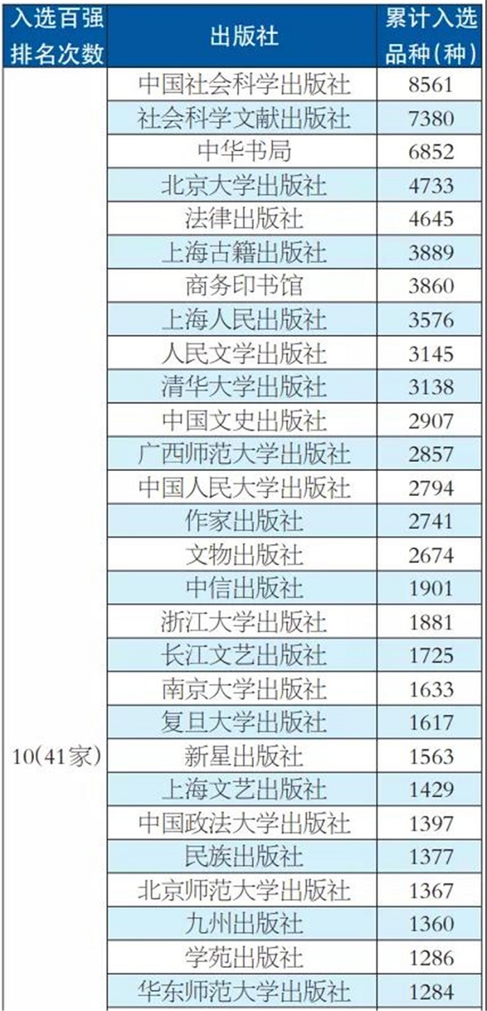 表1 2021年中国出版社进入世界图书馆系统品种排行榜(前100名选登)
