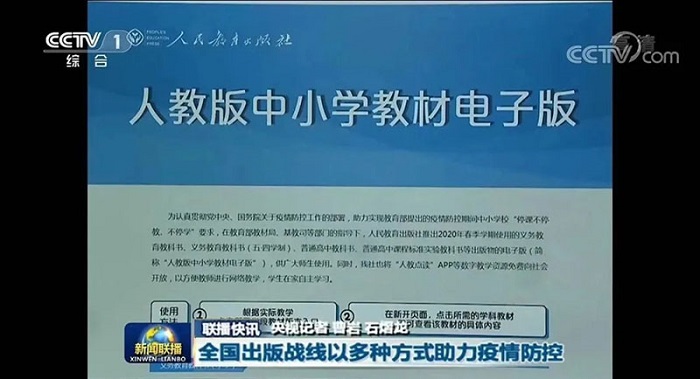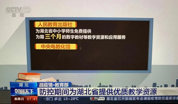 2020年的1月底,为支持湖北省560万师生“停课不停学”,人民教育出版社及其所属人教数字出版有限公司向湖北省中小学师生免费提供为期四个月的数字教材等数字资源和应用服务。所有数字资源于2020年2月10日正式交付使用,捐赠资源价值约2.1亿元。自2月1日起,为保证全国中小学生“停课不停学”,人民教育出版社及其所属人教数字出版有限公司又将“人教点读”APP内所有数字教学资源全部免费开放,在疫情持续期间,满足全国所有中小学生学习需求,捐赠资源价值约1.68亿元。2021年的春季和秋季学期,部分地区因为疫情反复不得不采取在线教学,人教社先后又向云南省瑞丽市、河南省、江苏省扬州市、山东省烟台市等地捐赠人教数字教材资源,价值总计超过1.5亿元,保障了各地正常教学的开展。