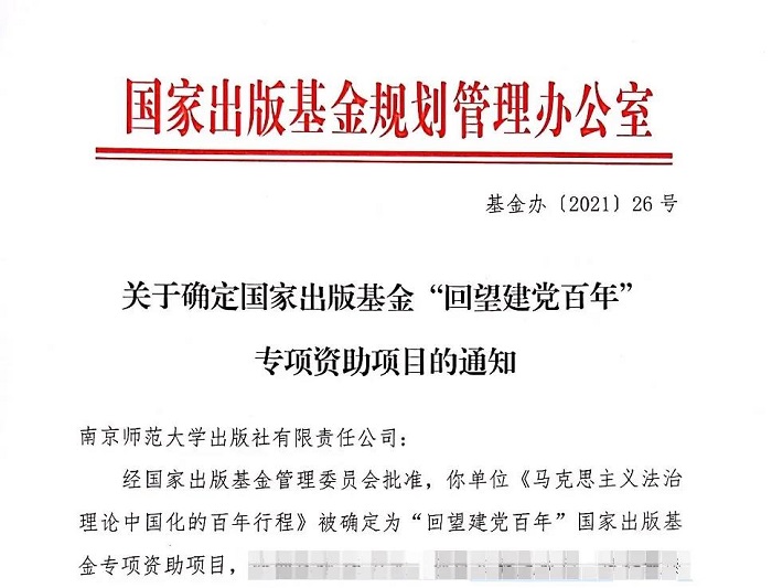 近日,国家出版基金规划管理办公室通知,南京师范大学出版社《马克思主义法治理论中国化的百年行程》被确定为“回望建党百年”国家出版基金专项资助项目。
