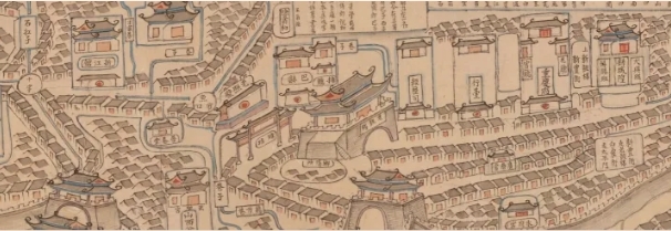 以整幅《渝城图》作为设计的底图并不现实,为了呼应《爪牙》一书的主人公:清代巴县县衙的书吏与差役,我们截取了《渝城图》的一部分,即巴县衙门局部图。