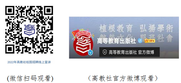 网上报名期间,高等教育出版社将组织线上招聘宣讲直播活动,欢迎应聘人员收看。宣讲会信息: