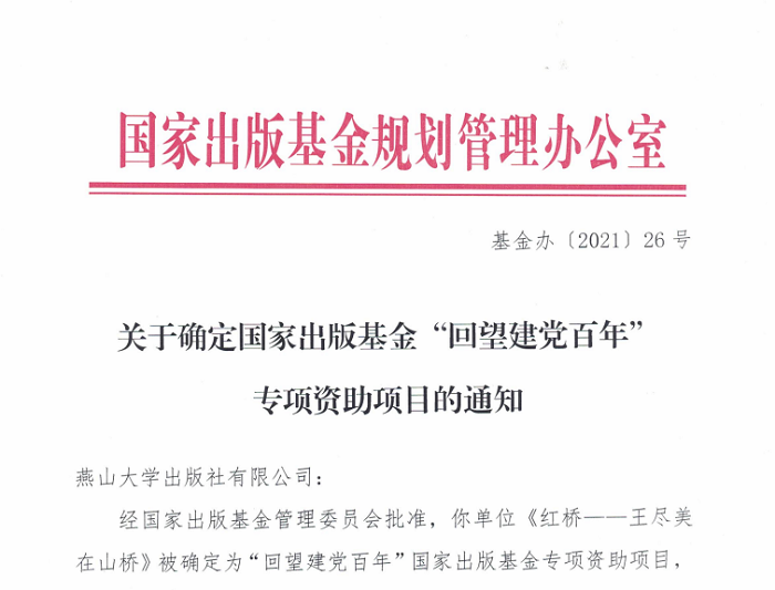 近日,经国家出版基金管理委员会批准,燕山大学出版社出版的《红桥——王尽美在山桥》成功获得国家出版基金“回望建党百年”专项资助。这是今年河北省唯一入选国家出版基金专项资助项目,也实现了燕山大学出版社建社以来的一次重大突破。